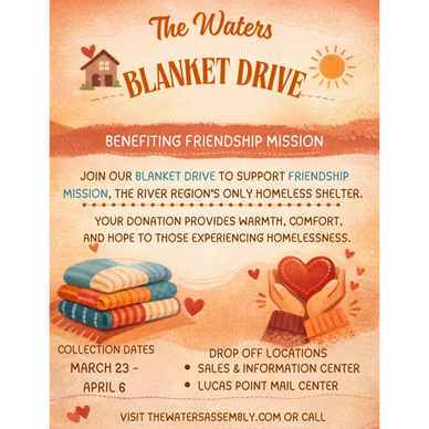 The Waters is proud to host a Blanket Drive in support of Friendship Mission, the River Region’s only homeless shelter.