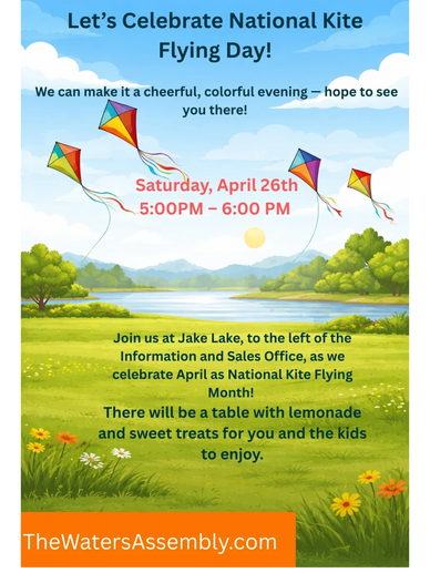 Join us for a cheerful, colorful evening at Jake Lake (to the left of the Information and Sales Office)